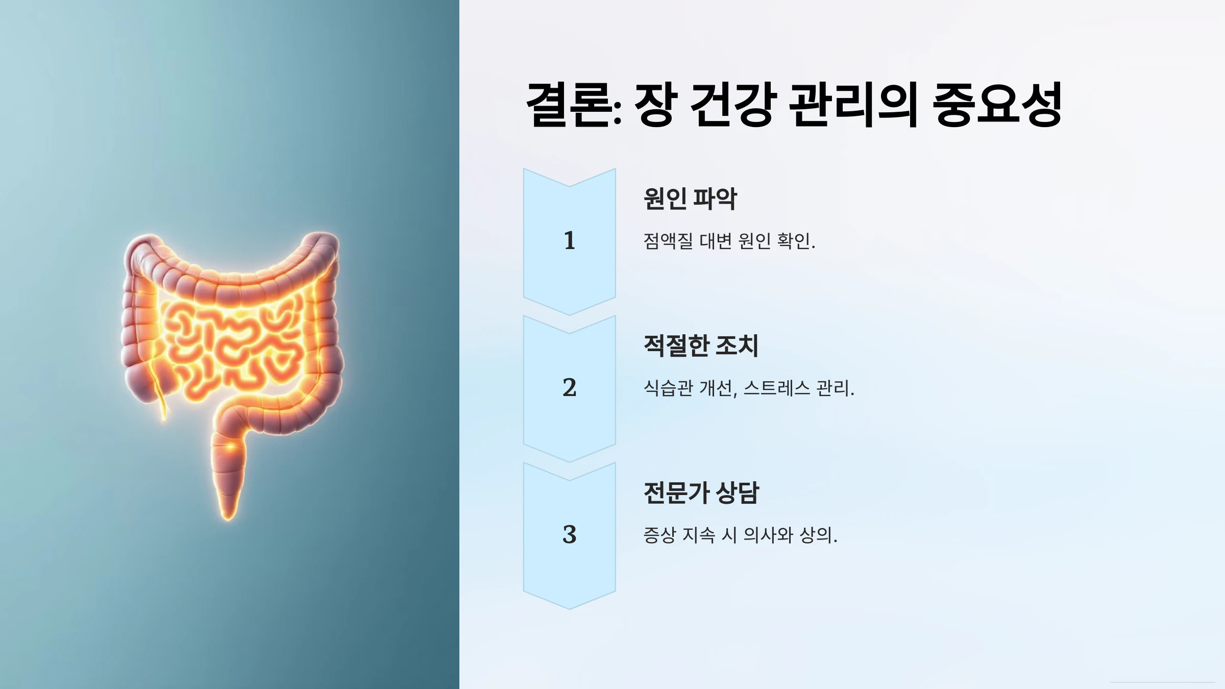 투명한 점액질 대변은 장 건강에 이상이 생겼을 때 나타날 수 있는 증상입니다. 원인에 따라 적절한 해결 방법을 적용하면 점액질 대변을 줄이고 장 건강을 회복할 수 있습니다. 만약 증상이 지속되거나 악화된다면, 반드시 의사와 상의하여 정확한 진단을 받고 치료하는 것이 중요합니다. 건강한 식습관과 스트레스 관리가 장 건강을 유지하는 핵심입니다.
