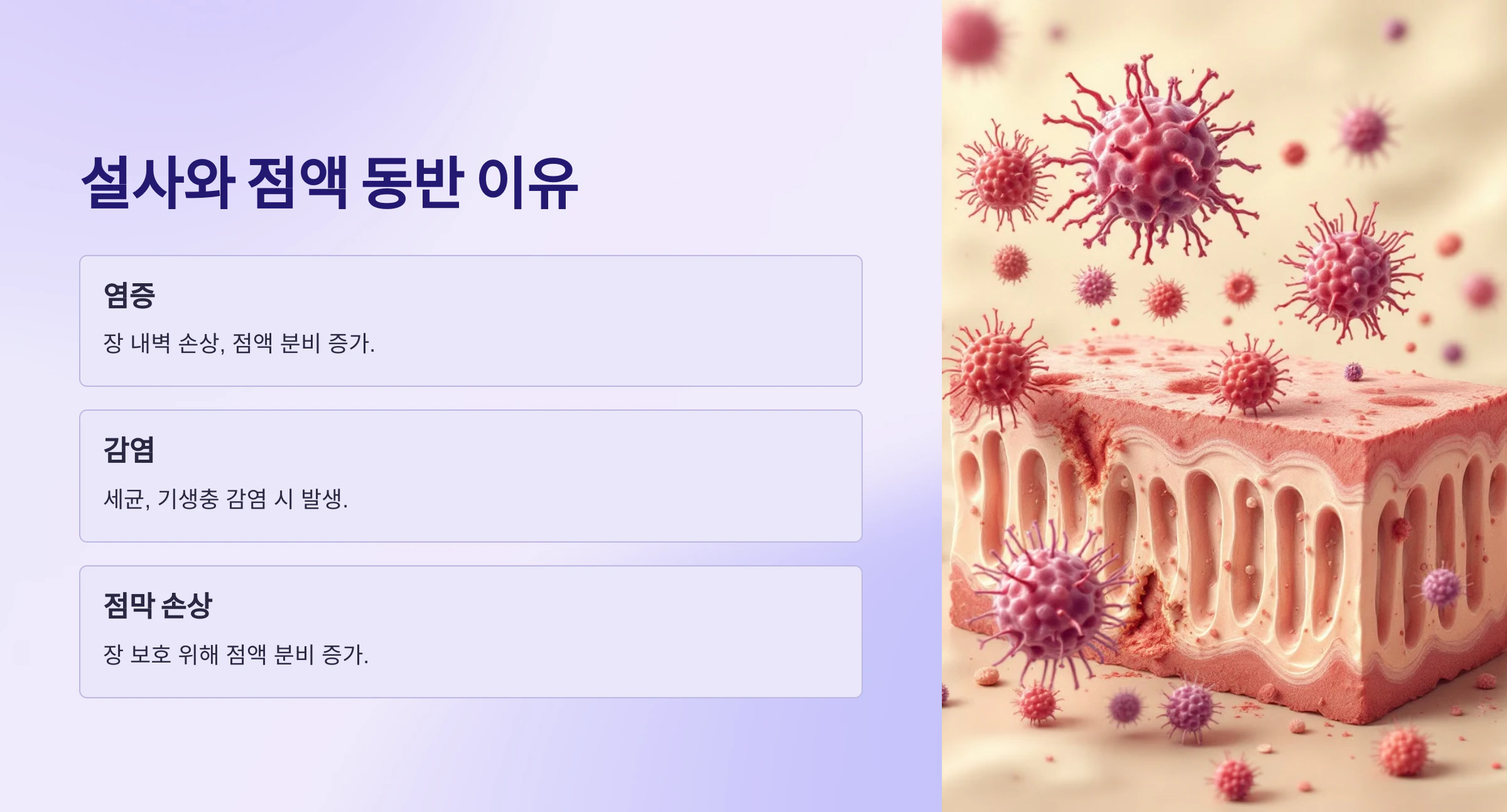 장염은 장 내벽의 점막을 손상시킬 수 있으며, 이로 인해 점막을 보호하기 위한 방어 메커니즘으로 점액이 더욱 많이 분비됩니다. 이는 장이 더 큰 손상을 입지 않도록 돕기 위한 과정이지만, 동시에 대변에 점액이 섞이는 원인이 됩니다.