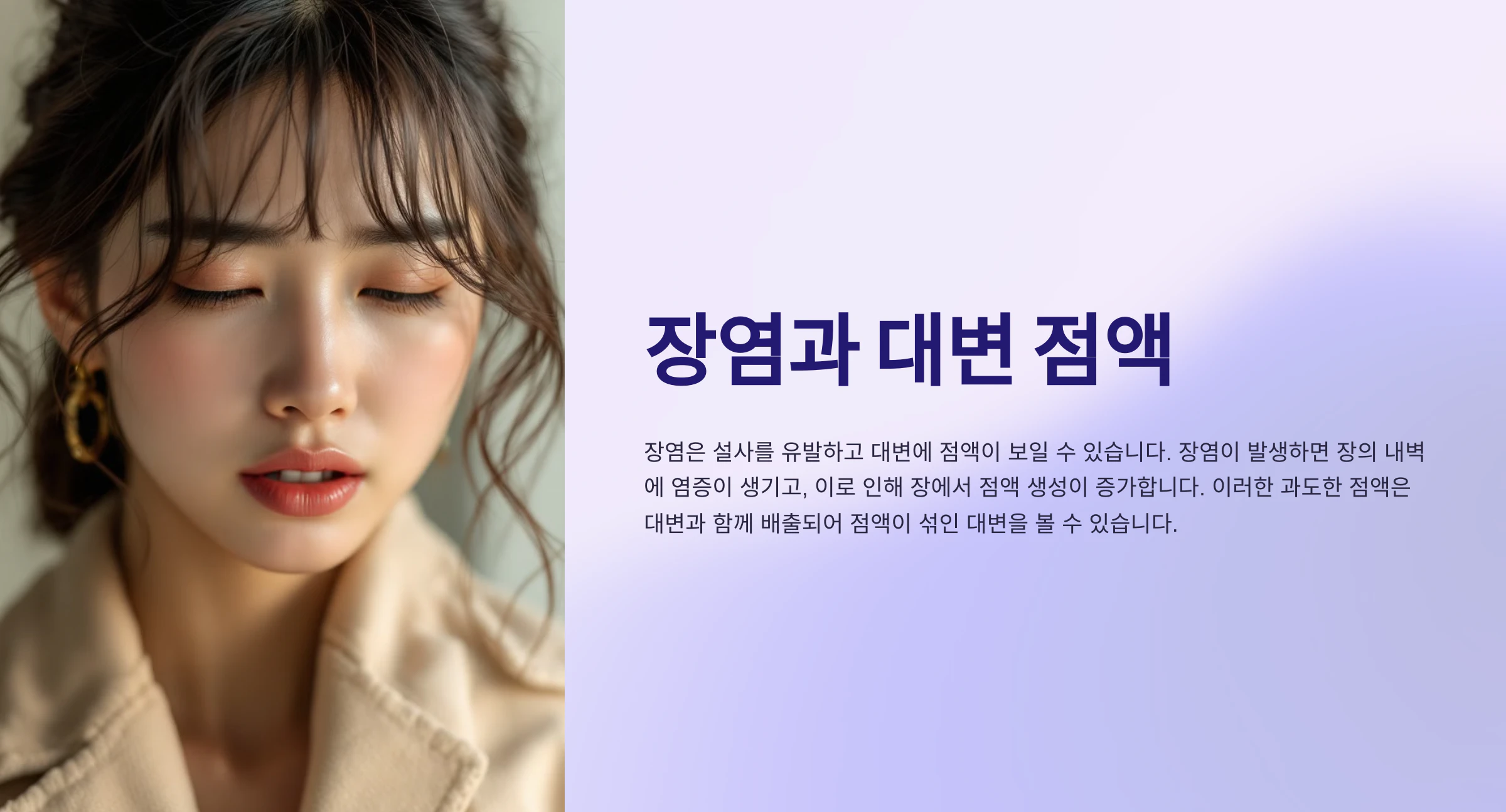 장염이 발생하면 장의 내벽이 손상되거나 염증으로 인해 자극을 받습니다. 이로 인해 장의 점액 분비 세포들이 과도하게 활성화되며, 그 결과 대변에 점액이 섞여 나옵니다. 염증은 특히 세균성 장염이나 크론병, 궤양성 대장염과 같은 염증성 장질환에서 흔히 발생하는 증상입니다.