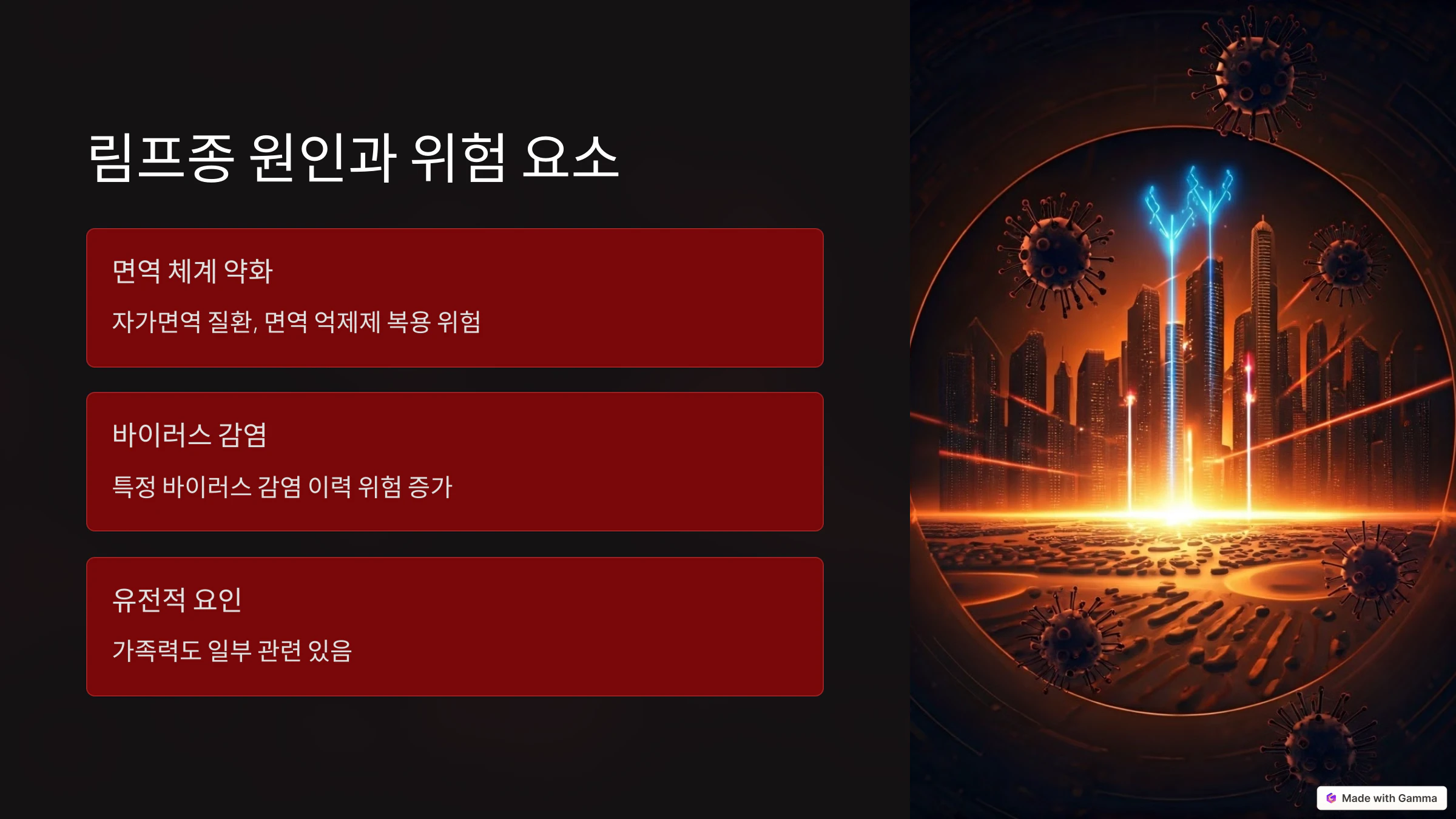 - 바이러스 감염: 특정 바이러스(예: 엡스타인-바 바이러스) 감염 이력이 있는 사람은 림프종에 걸릴 위험이 높습니다.
