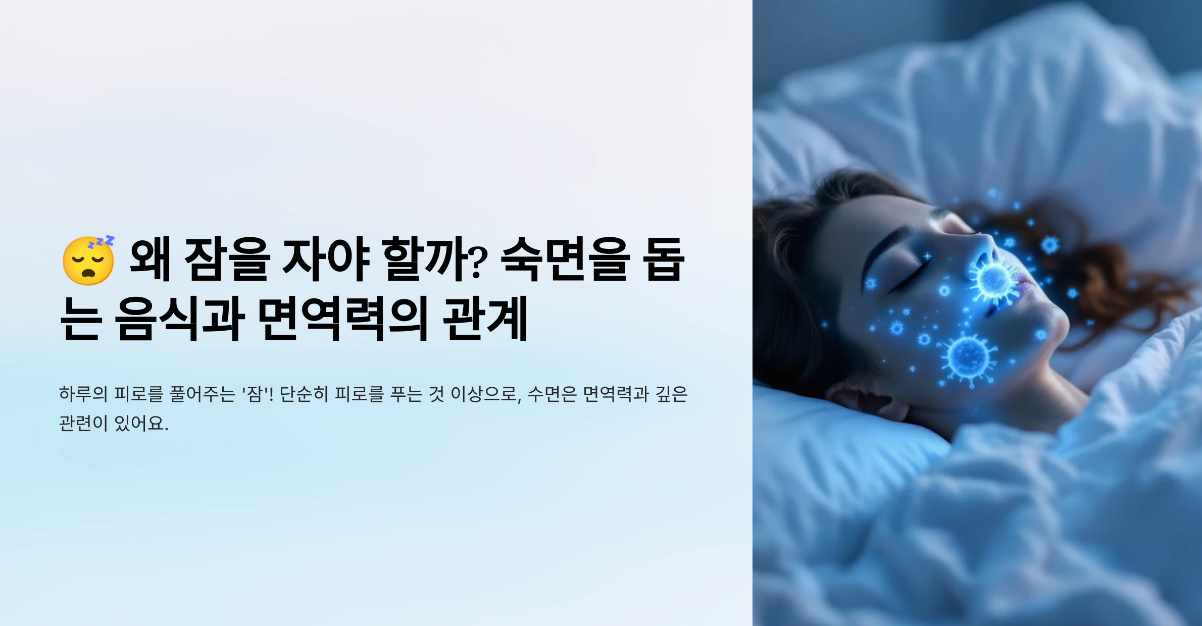 하루의 피로를 풀어주는 ‘잠’! 그런데 우리는 왜 잠을 자야 할까요? 단순히 피로를 푸는 것 이상으로, 수면은 우리의 면역력과도 깊은 관련이 있어요. 숙면을 위한 방법과 도움 되는 음식까지 함께 알아볼게요!