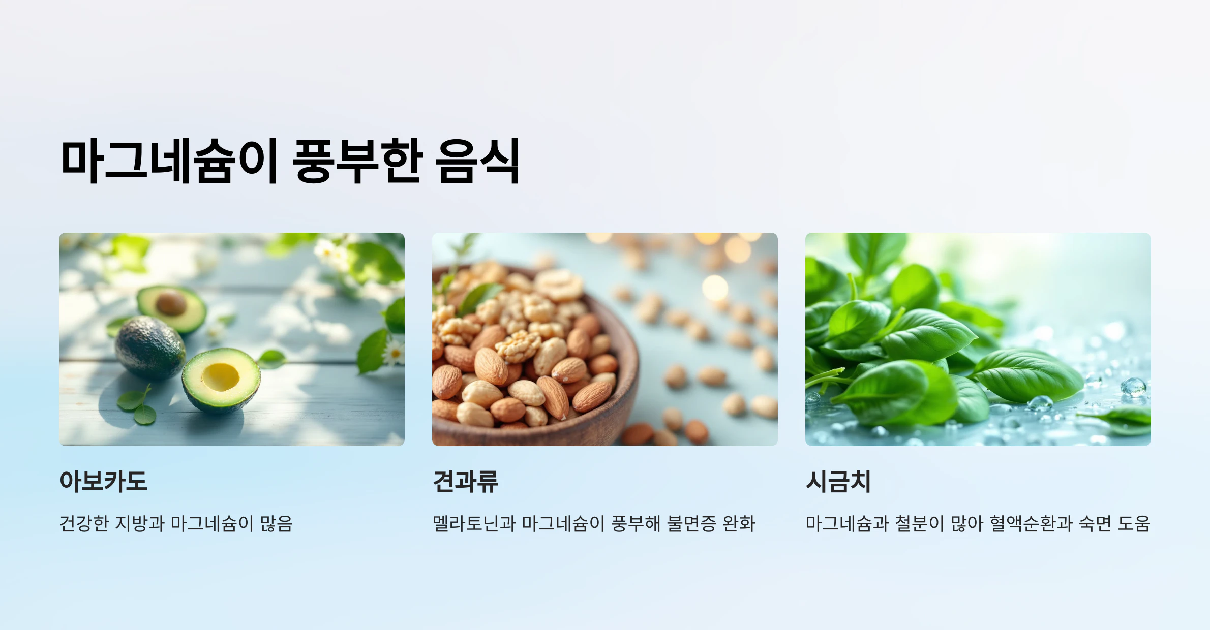 • 🌿 시금치: 마그네슘과 철분이 많아 혈액순환과 숙면을 돕는 역할을 해요.