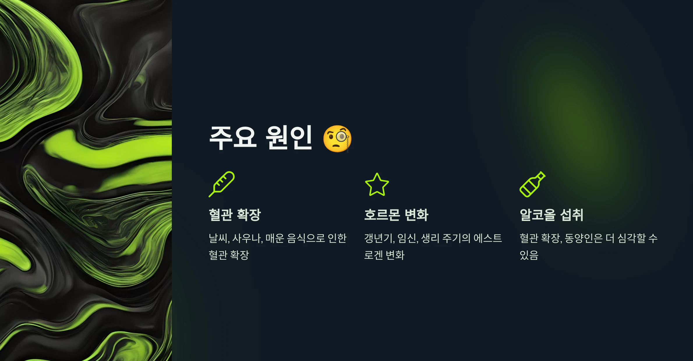 ✅ 알코올 섭취 – 술을 마시면 혈관이 확장되며, 특히 동양인은 알코올 대사 효소가 부족해 더 심할 수 있어요.