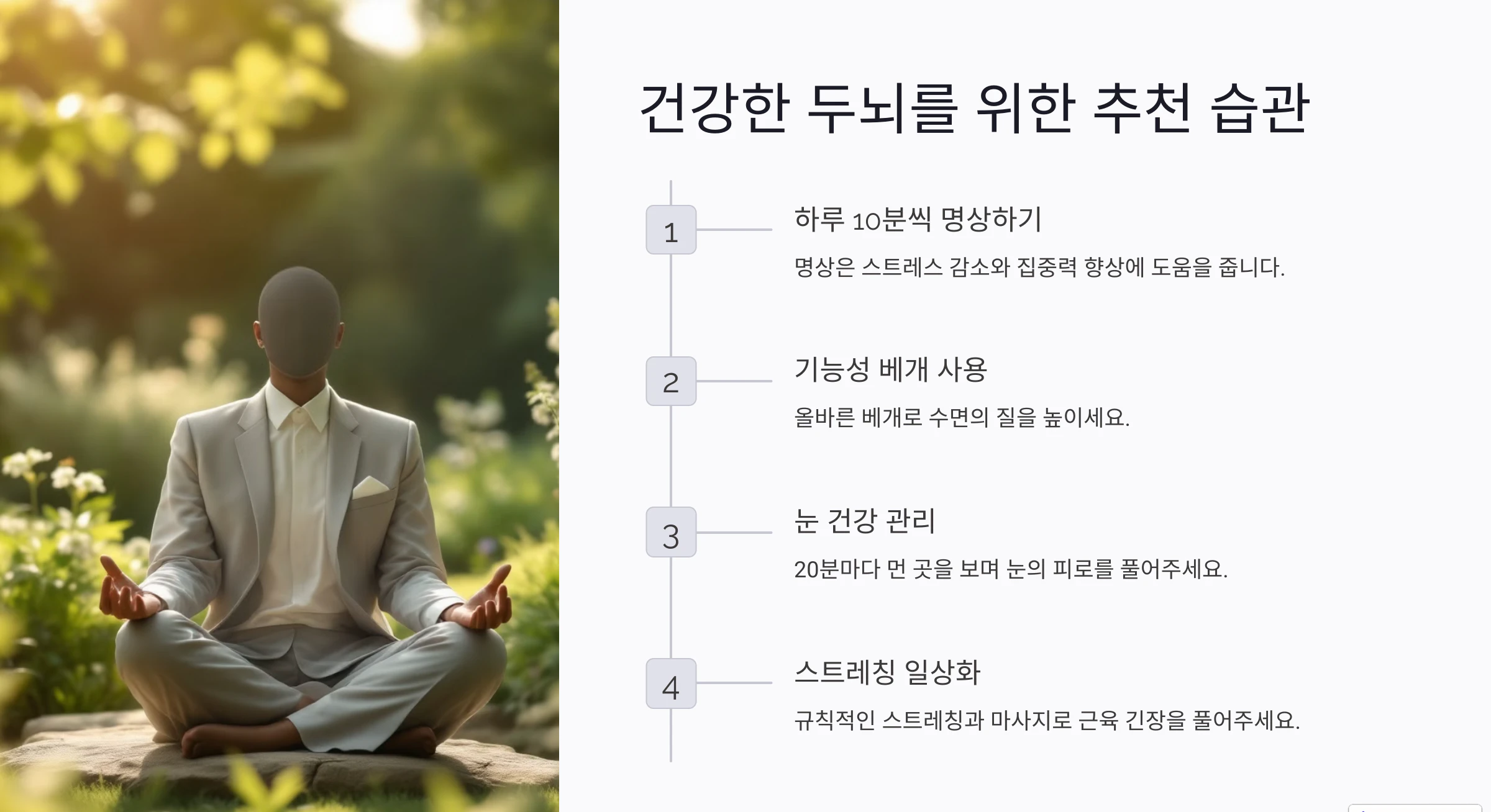 머리가 찌릿거리지 않도록 두뇌 건강을 지키는 습관도 중요해요.