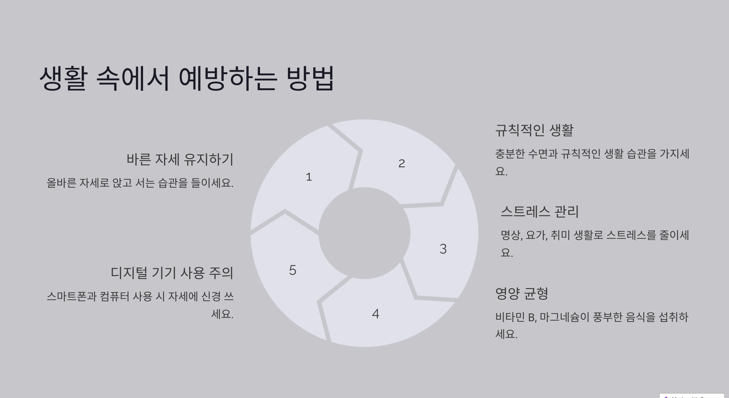 - 거북목 증후군: 장시간 스마트폰이나 컴퓨터를 사용하면 목이 앞으로 빠져 신경이 눌릴 수 있습니다.