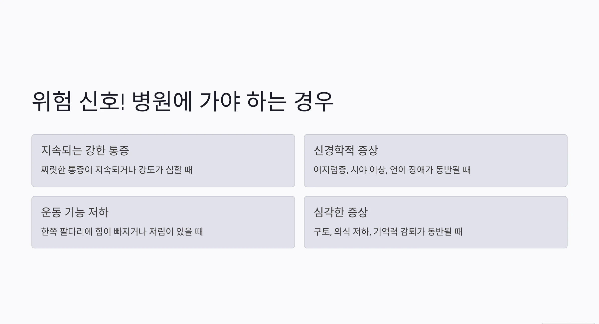머리가 찌릿거리는 증상이 단순한 피로나 스트레스 때문이라면 괜찮지만, 다음과 같은 증상이 동반된다면 즉시 병원을 방문하세요. 🚨