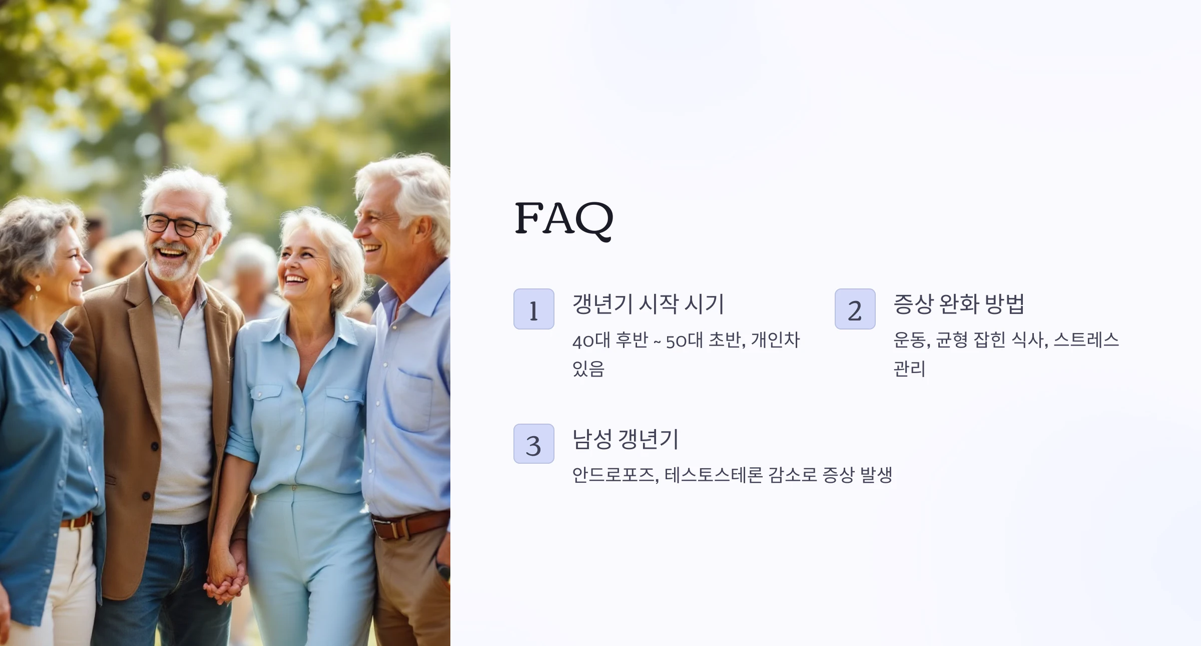 여성은 폐경(생리가 완전히 멈추는 시기) 을 앞두고 에스트로겐 감소로 인해 신체적·정신적 변화를 겪고, 남성은 테스토스테론 감소로 인해 피로감, 근력 저하 등을 경험할 수 있어요.